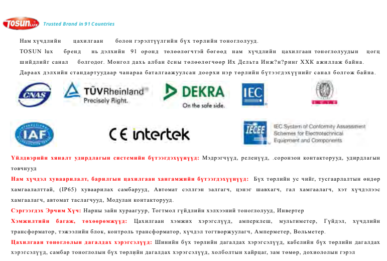 TOSUN lux бренд нь дэлхийн 91 оронд төлөөлөгчтэй бөгөөд нам хүчдлийн цахилгаан тоноглолуудын цогц шийдлийг санал болгодог. Монгол дахь албан ёсны төлөөлөгчөөр Их Дельта Инженеринг ХХК ажиллаж байна .Дараах дэлхийн стандартуудаар чанараа баталгаажуулсан доорхи нэр төрлийн бүтээгдэхүүнийг санал болгож байна.