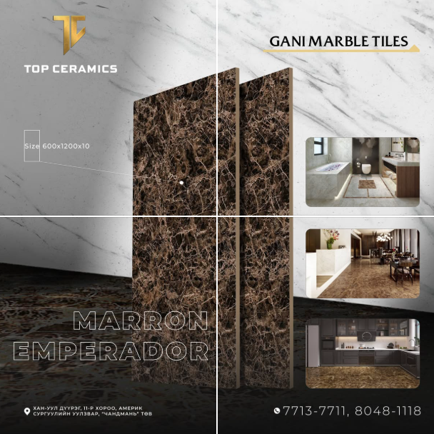 Дэлхийд шаазан плитагаараа TOP-10-т багтдаг “GANI” брэндийн хээ нь тасралтгүй үргэлжлэх тансаг шийдэл, байгалийн чулууг 100% дурайлгаж чадсан, ус чийг нэвтрүүлдэггүй эко хамгаалалт, НАНО гадаргуу, стандартаас давсан чанар, интерьерт тань төгс зохицох шийдлүүдийг агуулсан гантиг хавтанг албан ёсны эрхтэйгээр “TOP Ceramics” дэлгүүрээс.