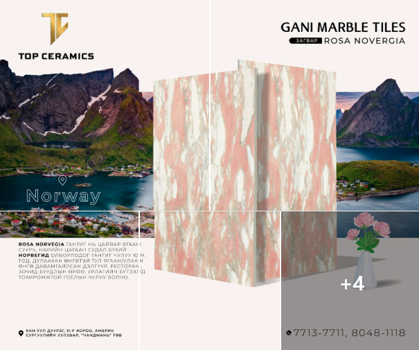 Дэлхийд шаазан плитагаараа TOP-10-т багтдаг “GANI” брэндийн хээ нь тасралтгүй үргэлжлэх тансаг шийдэл, байгалийн чулууг 100% дурайлгаж чадсан, ус чийг нэвтрүүлдэггүй эко хамгаалалт, НАНО гадаргуу, стандартаас давсан чанар, интерьерт тань төгс зохицох шийдлүүдийг агуулсан гантиг хавтанг албан ёсны эрхтэйгээр “TOP Ceramics” дэлгүүрээс.