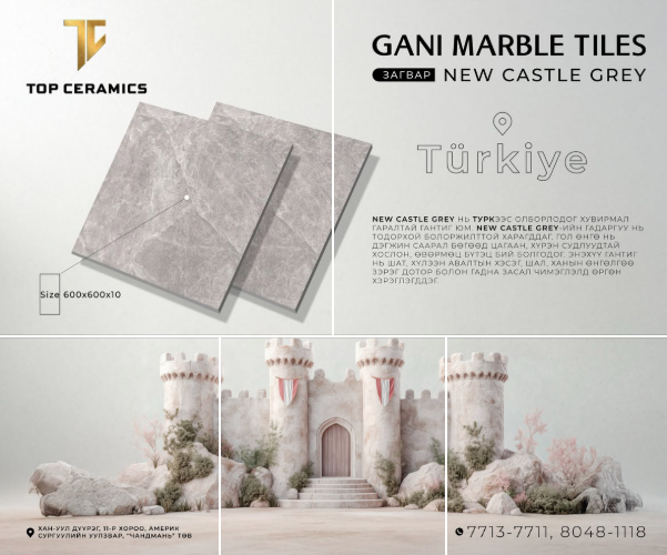Дэлхийд шаазан плитагаараа TOP-10-т багтдаг “GANI” брэндийн хээ нь тасралтгүй үргэлжлэх тансаг шийдэл, байгалийн чулууг 100% дурайлгаж чадсан, ус чийг нэвтрүүлдэггүй эко хамгаалалт, НАНО гадаргуу, стандартаас давсан чанар, интерьерт тань төгс зохицох шийдлүүдийг агуулсан гантиг хавтанг албан ёсны эрхтэйгээр “TOP Ceramics” дэлгүүрээс.