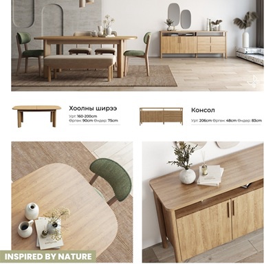 Орчин үеийн байгалийн өнгө төрхийг шингээсэн (160-200x90) сунадаг минималист хоолны өрөөний иж бүрдэл нь таны гэрт тааламжтай өнгө төрхийг авчрахаас гадна хурц ирмэггүй тул бага насны хүүхэдтэй айлд нэн тохиромжтой.