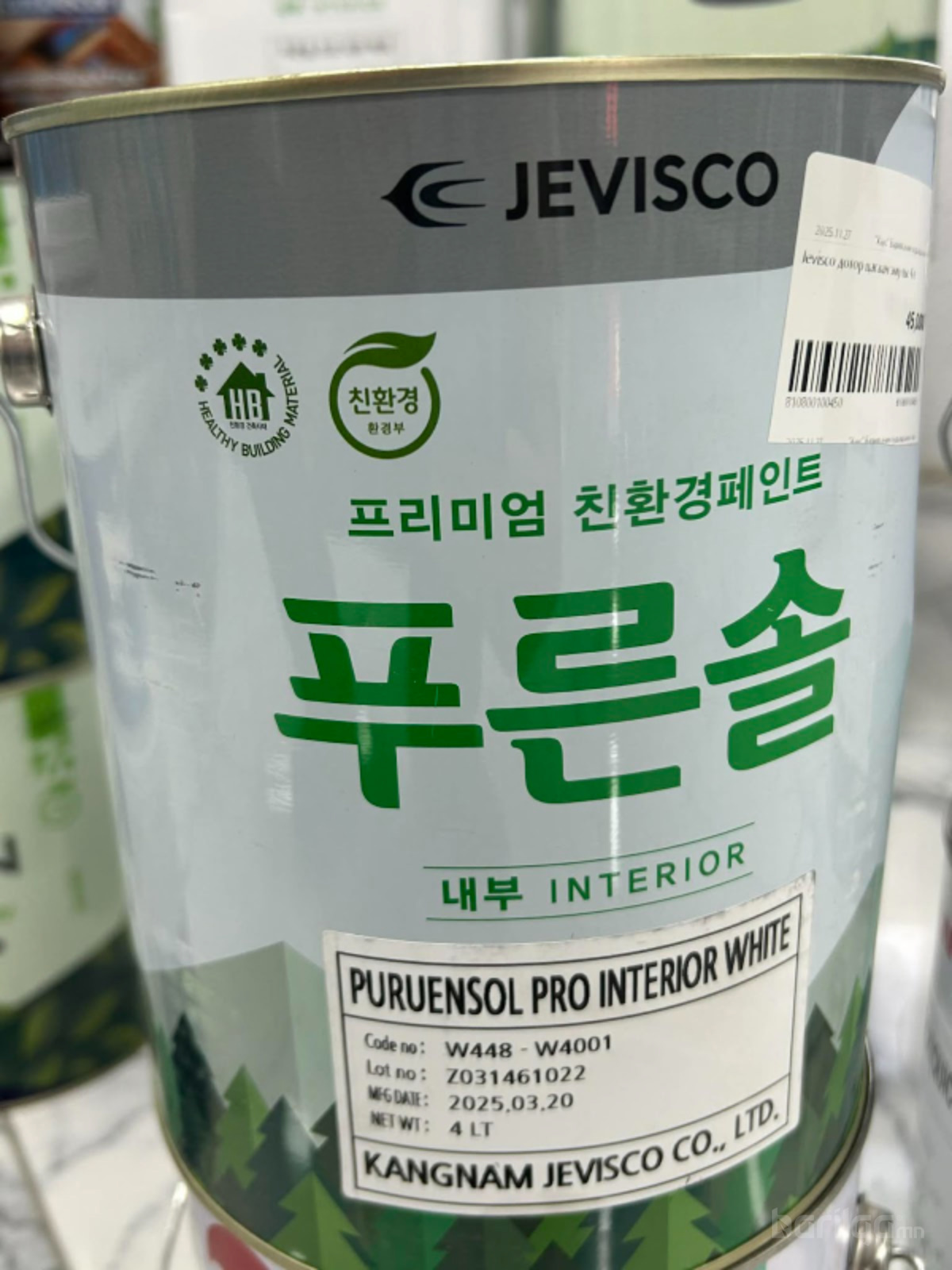 Jevisco Interior Emulsion Paint 4 L — Солонгосын JEVISCO үйлдвэрийн дотоод ханын заавал цагаан өнгөтэй усан суурь (эмульс / acrylic) будаг юм. Живиско нь архитектур, дотор болон гадна будагны шийдлүүдтэй алдартай компани бөгөөд дотор талбайн хананд замаск, бетон, гипсэн хавтан гэх мэт гадаргууд дээр хэрэглэгддэг будаг үйлдвэрлэдэг.